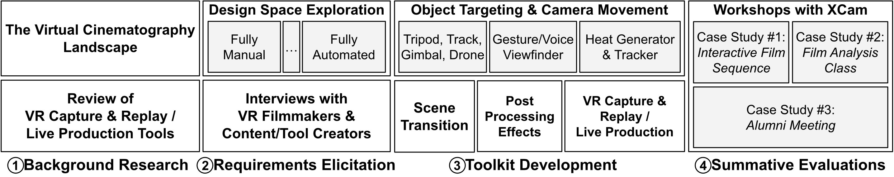 This study was conducted in four major steps. We started by studying the landscape of virtual cinematography across research work and industry practice, as well as conducting a survey of VR tools supporting capture-and-replay or live production. To elicit requirements for XCam and explore the design space of mixed-initiative control, we developed six example applications and conducted interviews with six experts in filmmaking and VR tool/content creation. Informed by these studies, we developed XCam toolkit separating the principles of object targeting, camera movement, and scene transition. Finally, we conducted individual follow-up workshops with three of the experts developing three case studies using XCam.