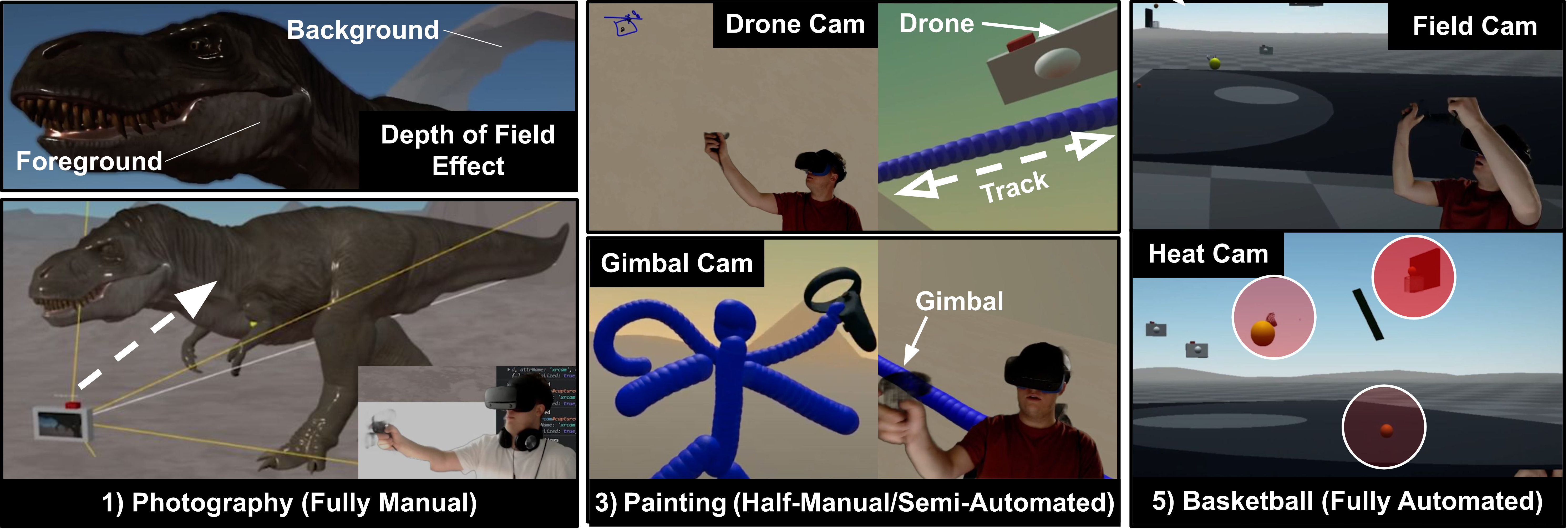 As VR technologies evolve, they are increasingly used to expand access to events, such as conferences, social gatherings, and immersive experiences that were once limited to in-person attendance. However, capturing and streaming these virtual moments remains challenging, often relying on complex setups or being restricted by a single viewpoint, which limits their expressive potential. Meanwhile, user-created videos on platforms like TikTok thrive by creatively using simple tools such as smartphone gimbals and drones. In professional filmmaking, AR/VR-based virtual production, seen in shows like The Mandalorian, is replacing traditional greenscreens with real-time immersive environments. These advancements highlight a growing need for more dynamic and cinematic VR capture solutions. In this study, we explore how cameras can enhance VR capture and live production. Drawing from social media, performance art, and filmmaking trends, we develop intuitive tools that support creative control, balancing AI automation with manual input to make virtual cinematography accessible and expressive.